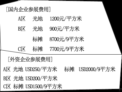 長(zhǎng)期以來(lái),我國(guó)展覽行業(yè)一直存在這一現(xiàn)象,對(duì)外商實(shí)行一個(gè)收費(fèi)標(biāo)準(zhǔn),對(duì)國(guó)內(nèi)企業(yè)甚至包括一些合資、三資企業(yè)實(shí)行另一個(gè)收費(fèi)標(biāo)準(zhǔn),即在同一時(shí)間、同一場(chǎng)地,同樣是參展商,收費(fèi)卻相去甚遠(yuǎn),如下圖(首創(chuàng)展覽A圖)所示。展覽行業(yè)的雙軌制不僅在攤位的費(fèi)用,在展臺(tái)裝修、展品運(yùn)輸物品租憑、會(huì)刊廣告,以及展覽館對(duì)主辦單位收取的館租等方面同樣存在。對(duì)此,海外參展商意見(jiàn)很大,抱怨越來(lái)越多。