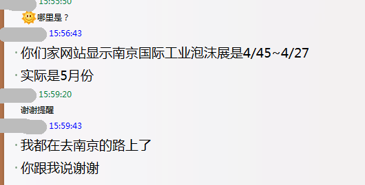 今天我們的客服們收到了一個(gè)投訴,我們的展會(huì)信息排期不對(duì),他已經(jīng)在出發(fā)的路上,要我們抱歉還問(wèn)有什么賠償。據(jù)咨詢(xún)客稱(chēng),他的身份不是參展商,是觀展的人。我們也沒(méi)有考證究竟是發(fā)布的展會(huì)錯(cuò)誤還是正確,咨詢(xún)客是否已在出發(fā)路上,還是我們被愚弄了。