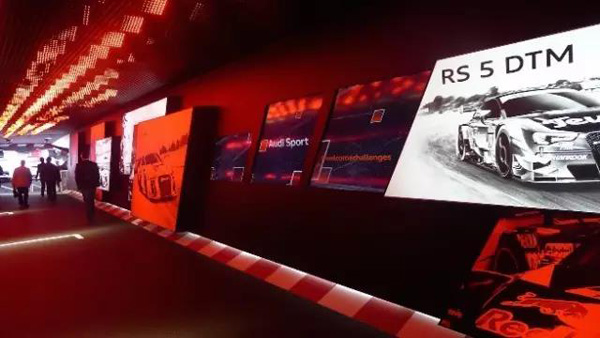 奧迪品牌核心理念“突破科技,啟迪未來(lái)“貫穿整個(gè)展臺(tái)的設(shè)計(jì),參觀者一踏進(jìn)展館,就會(huì)被通往內(nèi)館的隧道所吸引,光、影、聲音交織將參觀者一